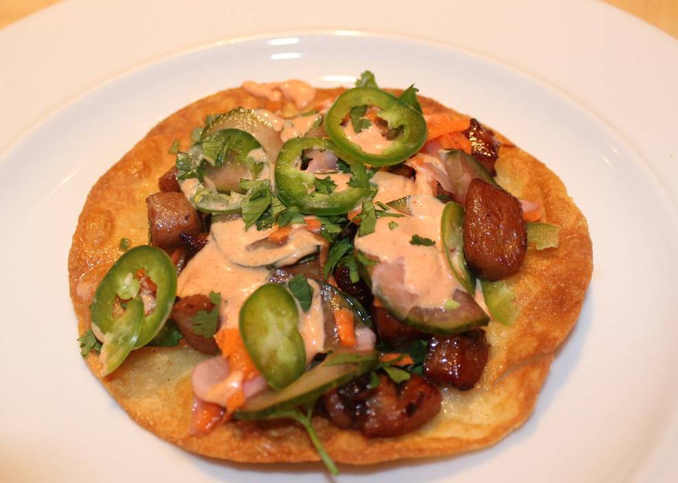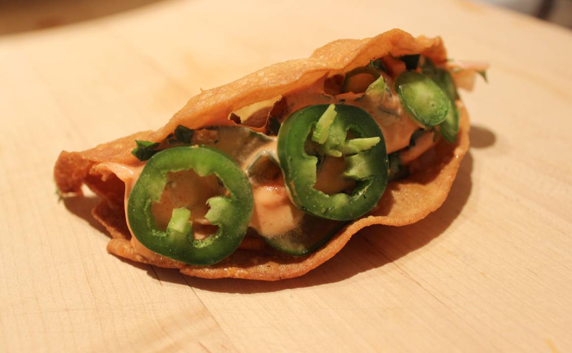 - To assemble: Fill the puffy taco shells with the caramelized pork, and top with the pickled vegetables, jalapeño, cilantro, and a drizzle of spicy mayo.