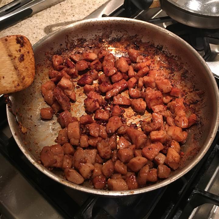 - Drain off the pork marinade. Heat a little bit of oil in a pan, and cook the pork until caramelized. Should take about 5 minutes.