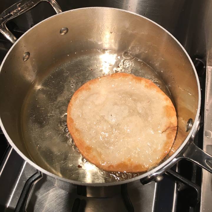 - In a shallow pot, heat oil to 375°F – Carefully lower one tortilla at a time into the oil. Once the tortilla begins to puff up and rise to the top, gently push the edge of a metal spatula into the center, bending it in half like a taco shape. Hold in place and cook until golden brown. Drain on paper towels and repeat the process.