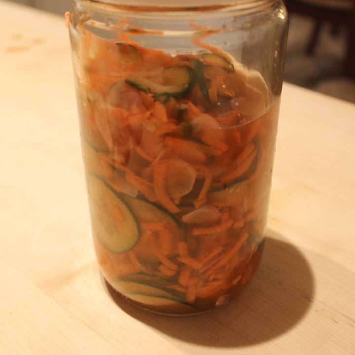 - Make the pickles: in a bowl or sealable container, mix vinegar, sugar, and salt. Then mix in the vegetables and let sit for at least 1 hour.